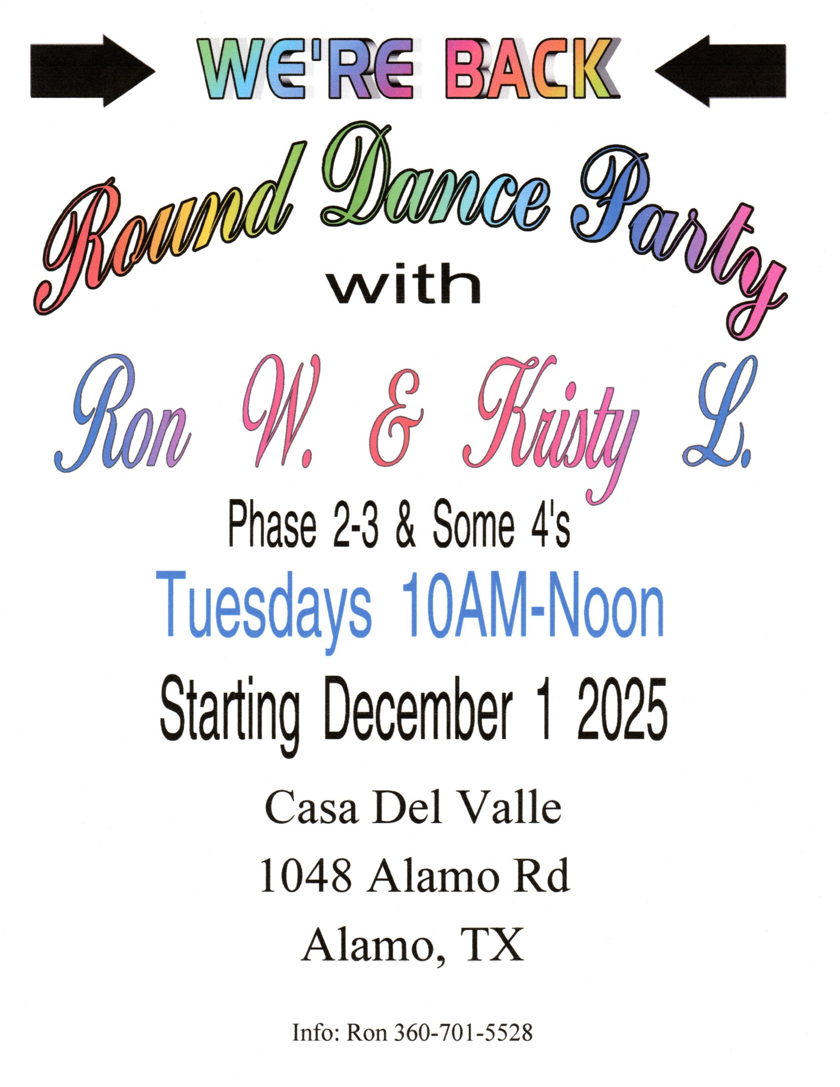 Our first dance will be the dance party at Casa Del Valle on Tuesdays from 10Am to Noon starting December 1st with Ron Woolcock and Kristy Lake. Attached is a flyer.